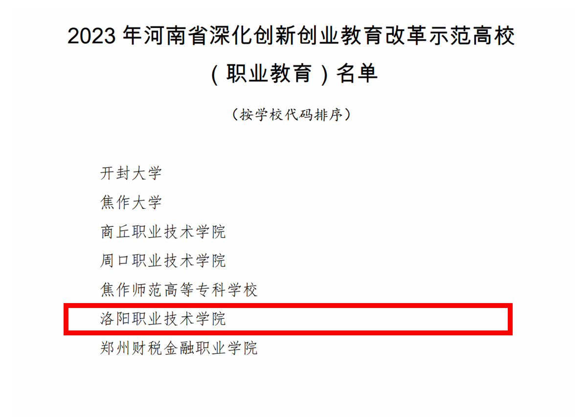 近日,河南省教育厅公布了2023年河南省深化创新创业教育改革示范高校(职业教育)名单,洛阳职业技术学院成功入选。