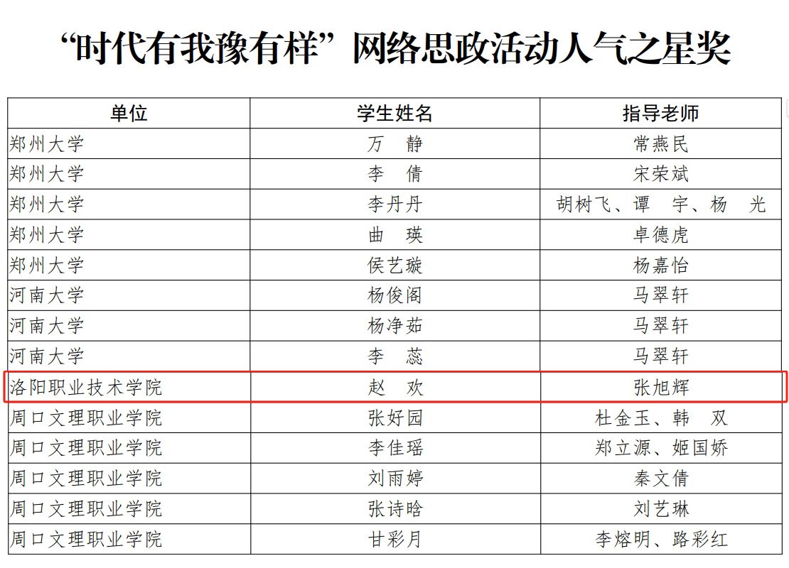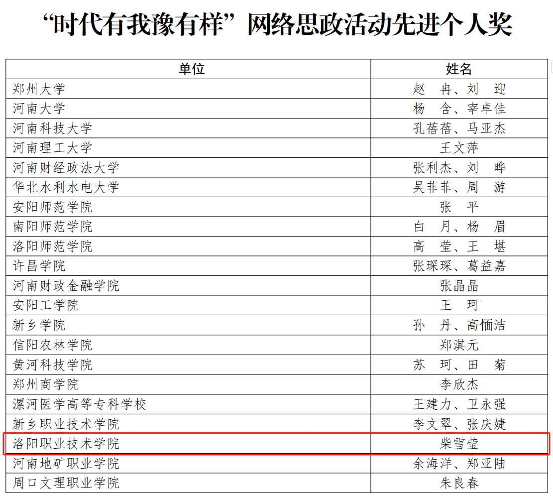 近日,省委教育工委、省教育厅公布“时代有我豫有样”网络思政活动获奖结果,我校荣获优秀组织奖,食品与药品学院老师柴雪莹荣获先进个人奖,融媒体中心记者团成员赵欢荣获人气之星奖。
