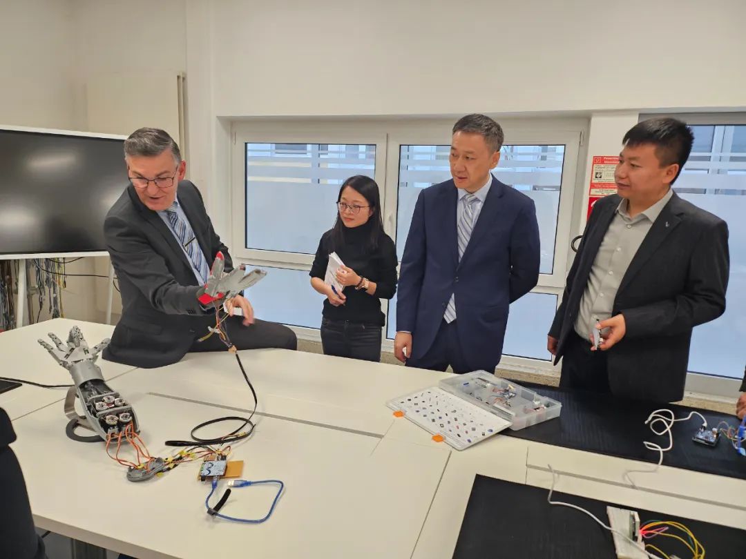 德国巴登符腾堡州经济协会教育集团是一家非营利性的机构,在德国巴登符腾堡州拥有强大的组织网络,共有50多个分支机构约700名工作人员,致力于帮助人们进行职业教育教学、培训、资格认证等,并提供职业教育咨询服务。赵健与集团国际部主任Marco Lietz、卡尔斯鲁厄理工学院博士研究员Rick Horsting, Benedikt Spindler进行了深入交流,并与巴符州经济协会教育集团就智能制造领域教师“双元制”教学能力师资培养计划签署合作协议。双方就增材制造、精益制造、绿色制造技术以及VR、AI技术在智能制造行业的运用和相关职业培训等进行了探讨。会后,考察团参观了卡尔斯鲁厄理工学院机械工程和计算机工程实验室。