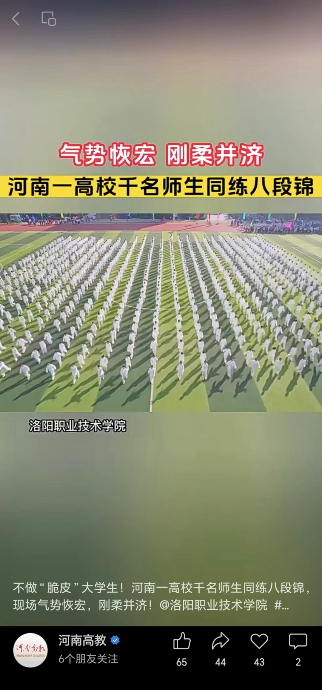 2023年10月30日,河南高教微信视频号报道不做“脆皮”大学生!河南一高校千名师生同练八段锦,现场气势恢宏,刚柔并济!报道原文如下: