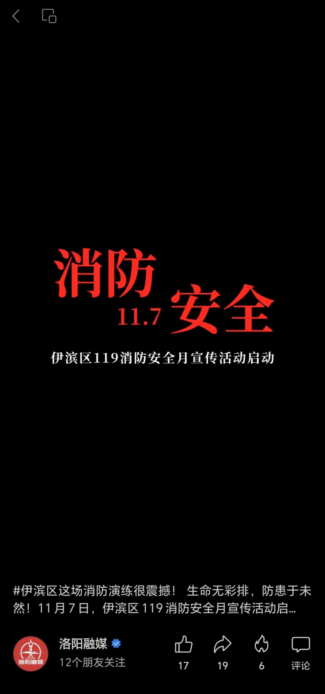 2023年11月7日,新华网微信视频号报道生命无彩排,防患于未然!11月7日,伊滨区119消防安全月宣传活动启动仪式在我校戏曲艺术学院北广场举行。三十秒带你看现场消防演练!报道原文如下: