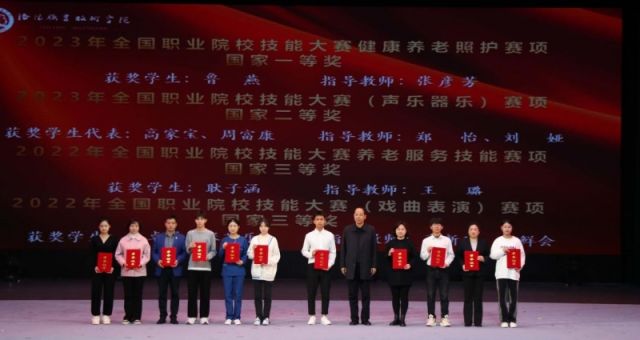 活动现场,任晓平、高丁、耿晓洁分别为近两年来在全国、省市及学校健康养老服务技能大赛中获奖的师生代表颁奖。