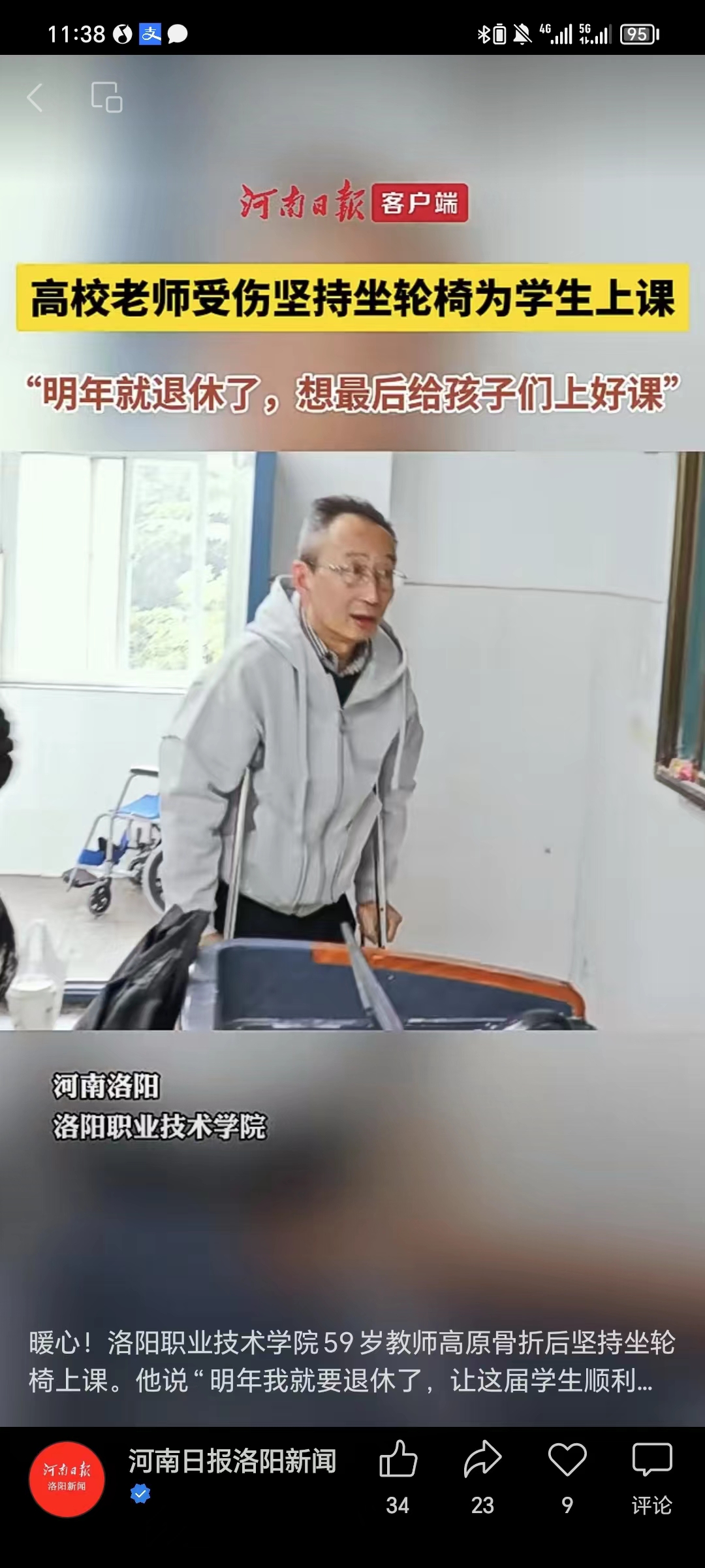 2023年11月13日,河南日报洛阳新闻微信视频号报道暖心!洛阳职业技术学院59岁教师高原骨折后坚持坐轮椅上课。他说“明年我就要退休了,让这届学生顺利完成学业,我才能安心。”报道原文如下: