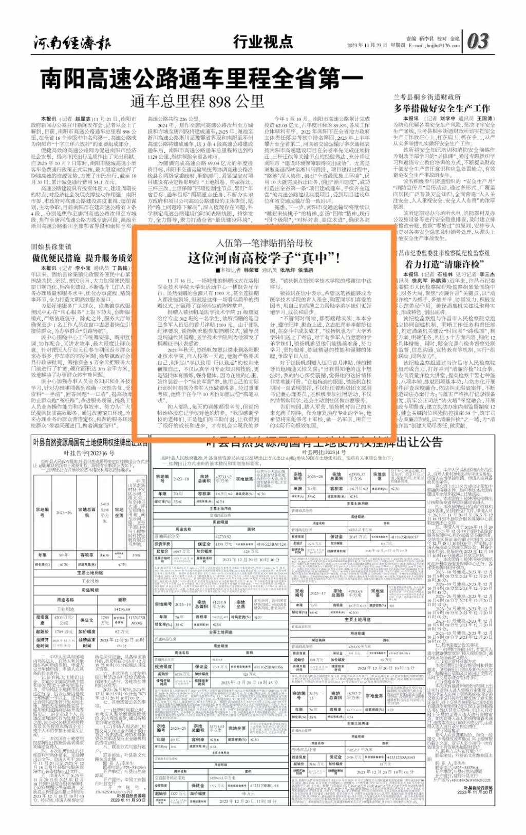 2023年11月23日,河南经济报报道入伍第一笔津贴捐给母校,这位河南高校学子“真中”。报道原文如下: