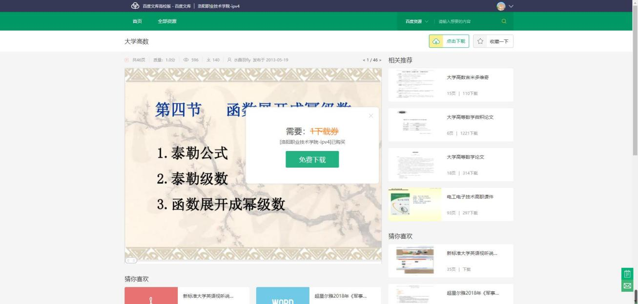 使用方法:学校IP范围内打开https://eduai.baidu.com/进入百度文库高校版主页,登录(手机验证个人账户)进行免下载券不计次直接下载。(建议使用360浏览器)