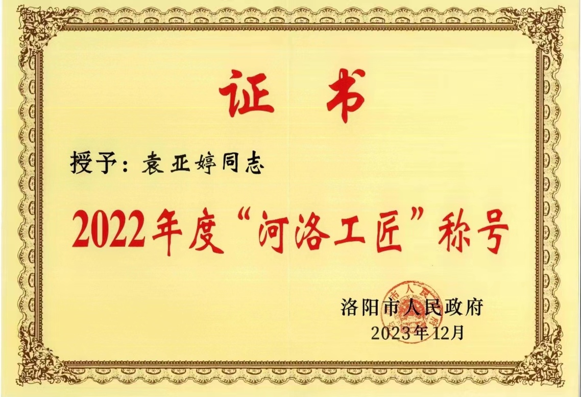 近日,洛阳市人民政府公布2022年度“河洛大工匠”和“河洛工匠”名单,洛阳职业技术学院文物保护考古学院2021级学生袁亚婷荣获2022年度“河洛工匠”称号。