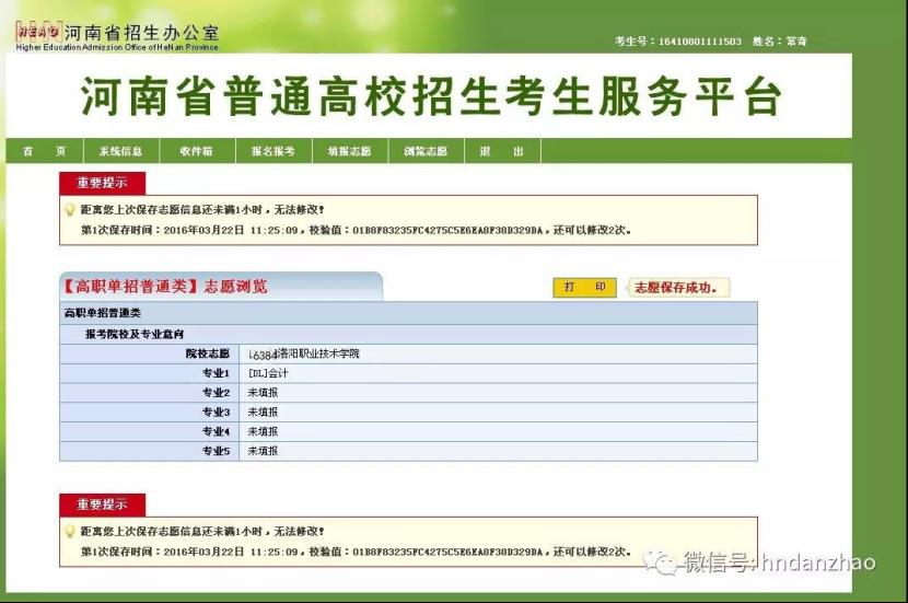 5、志愿保存成功后,系统自动跳转到志愿信息浏览页面,显示考生已经填报的志愿信息,考生可以点击打印按钮打印志愿信息。如图所示