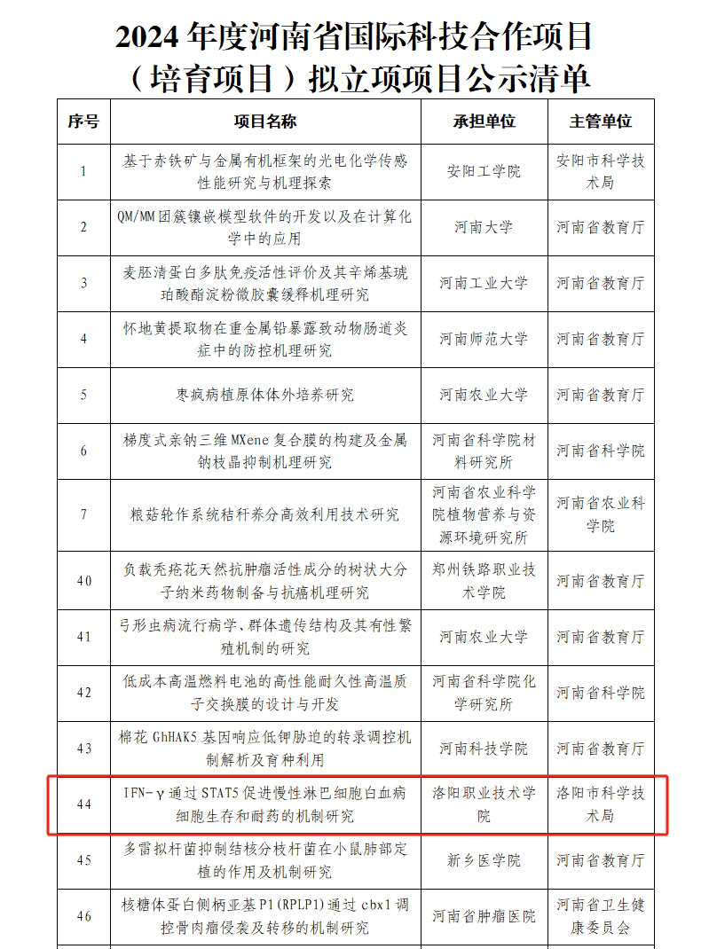 近日,河南省科学技术厅公布2024年度河南省国际科技合作项目拟立项项目名单,我校承担项目《IFNY通过STAT5促进慢性淋巴细胞白血病细胞生存和耐药的机制研究》成功入选培育项目,是我校首个省级国际科技合作项目。
