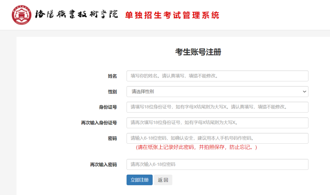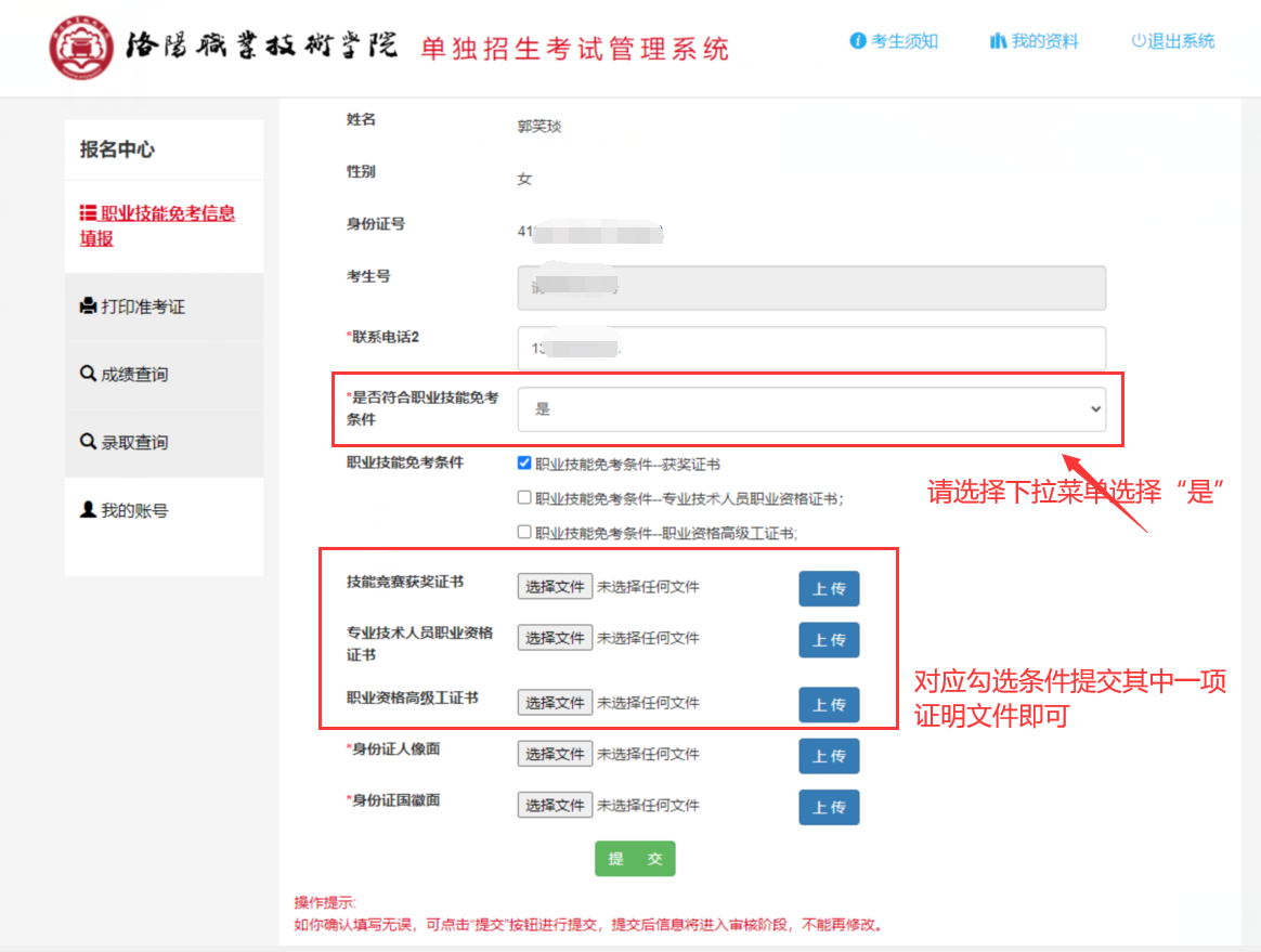 (2)完成上述志愿填报后,考生须于3月19日9时至3月21日18时,登录学校招生信息网(https://zjc.lypt.edu.cn/)完成“职业技能免考”基本信息填报和证明资料(获奖证书、专业技术人员职业资格证书、职业资格高级工证书、身份证等原件照片)提交。