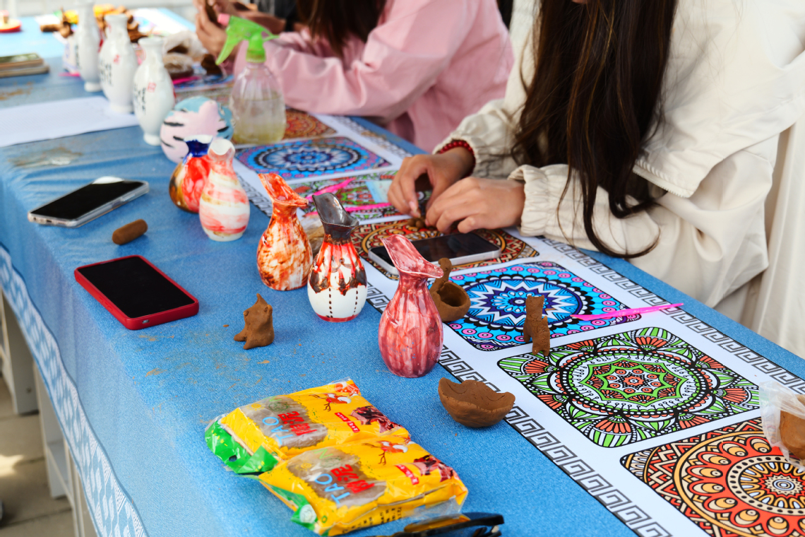 古风书签制作、手工陶艺体验、彩色拓印临摹、团扇压花、围棋对弈、投壶游戏等丰富多彩的国风活动吸引了众多师生参与其中,亲身感受中华优秀传统文化的独特韵味,还可以通过活动赢取精美国风小礼品。