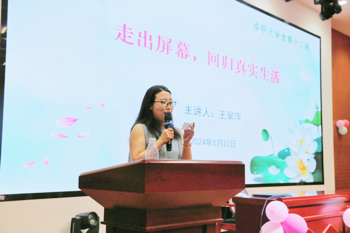 5月22日上午,洛职大讲堂第12期在大学生活动中心心理剧场开讲。洛阳师范学院心理学博士王翠萍应邀为广大师生作了一场“走出屏幕 回归真实生活”专题讲座。