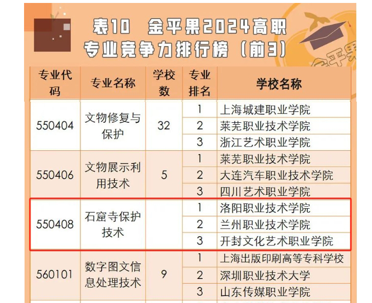 近日,“金平果”2024高职专业及专业群排行榜发布,其中2024高职专业竞争力排行榜石窟寺保护技术专业排行中,我校高居全国第一。