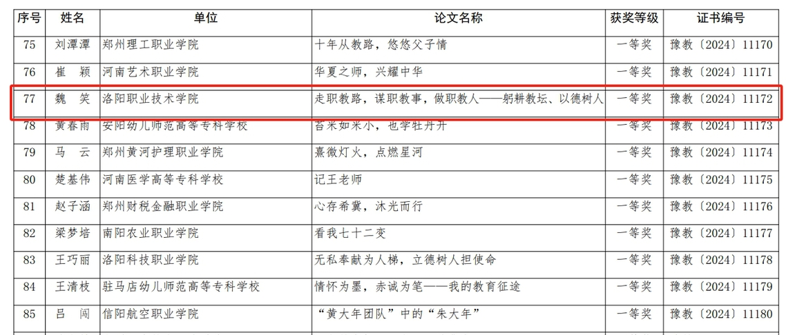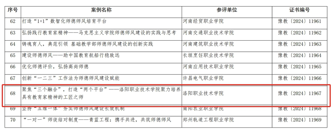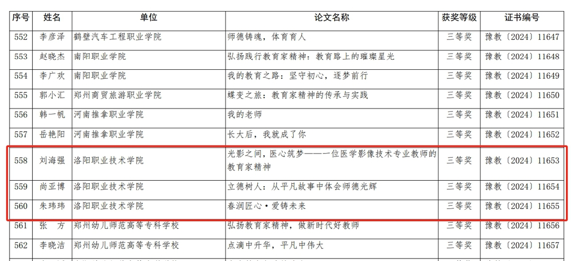 在师德主题教育征文比赛中,我校食品与药品学院魏笑参赛论文《走职教路,谋职教事,做职教人——躬耕教坛、以德树人》获得一等奖;护理与康养学院王若楠论文《心怀大爱,育人育心》、戏曲艺术学院曹艳艳论文《忠诚淡薄塑造良才,大国良师吾辈当先》获得二等奖;医学技术学院刘海强论文《光影之间,医心筑梦——一位医学影像技术专业教师的 教育家精神》、汽车与轨道交通学院尚亚博论文《立德树人:从平凡故事中体会师德光辉》、电商物流学院朱玮玮论文《春润匠心·爱铸未来》获得三等奖。在师德师风优秀案例评选中,我校参评案例《聚焦“三个融合”,打造“两个平台”——洛阳职业技术学院聚力培养 具有教育家精神的工匠之师》荣获优秀等次。