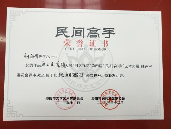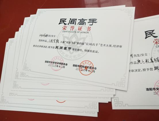 2024年1月1日至5日,“河洛飞花”第四届洛阳“民间高手”艺术大展在正大国际中心东座一楼举行。我院李益涛、常昊、仝仪涵、刘雨彤、朱少康、赵万通、桑浩瑞、何烨彤等20名同学获得“民间高手″荣誉称号,他们的文物修复作品在现场进行展览。此次活动由洛阳市文学艺术界联合会主办,河南省非物质文化遗产保护和智慧化中心联合主办,洛阳市民间文艺家协会、洛阳正大文化交流中心承办,洛阳市各县区文联、洛阳市各县区民间文艺家协会协办。今年大展以“歌颂新时代·共筑中国梦”为主题,旨在弘扬黄河文化和河洛文化,展示群众文化活动新成就,推动河洛文化生态保护实验区建设,以便在全社会营造非遗保护的浓郁氛围,提升市民对非遗的保护热情,感受传统文化的时代魅力。活动在2023年12月初启动,通过网络方式进行报名,共有400余位艺术家参赛,经过筛选,评出113位参赛者及作品。经过专家评审小组评议,我院20名学生的文物修复参赛作品均获得奖项,进一步提升了学生们的文化自信实践能力。 也为学院嬴得了荣誉。