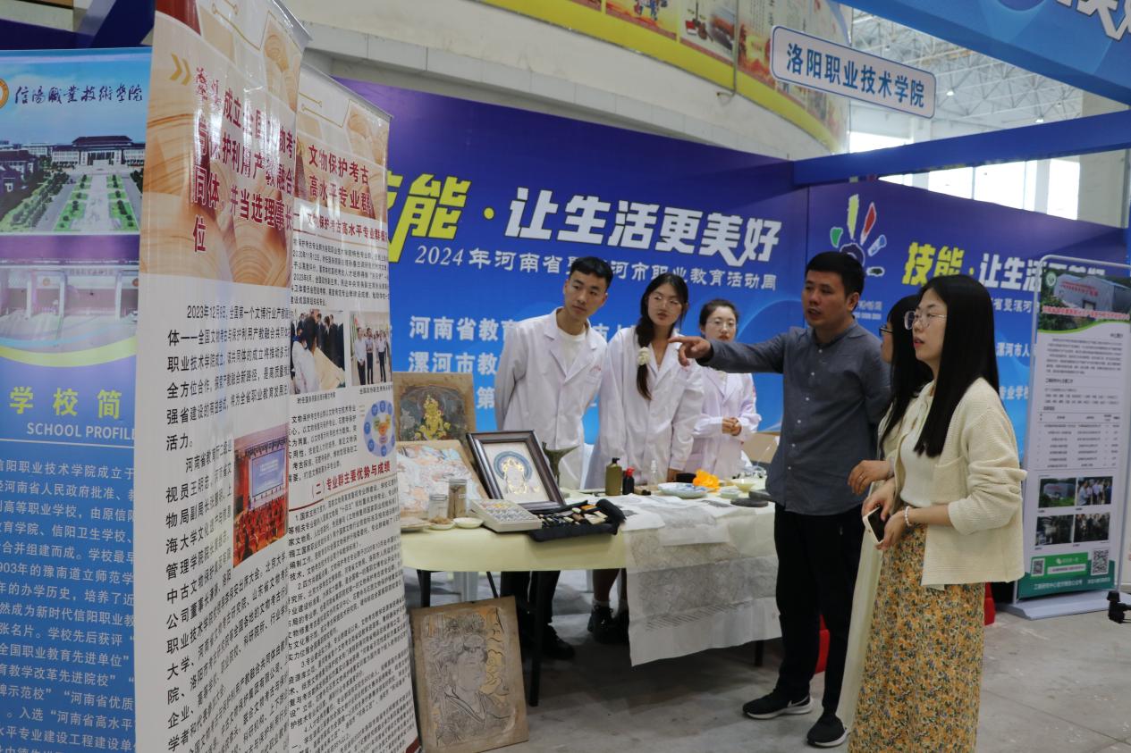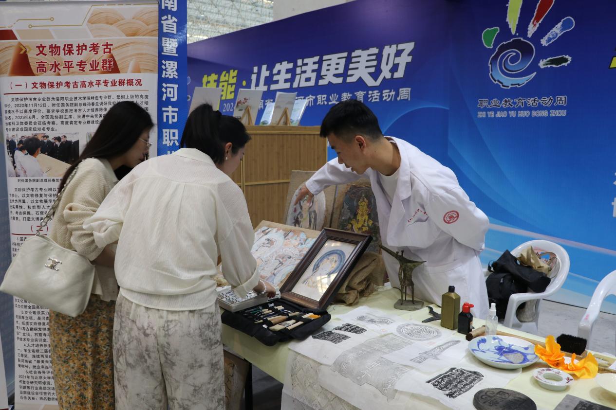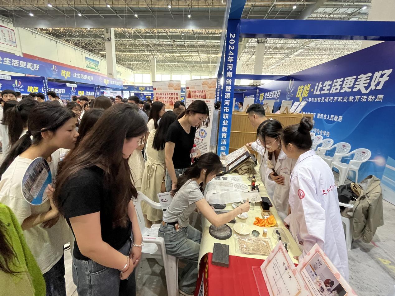 2024年5月8日,2024年河南省暨漯河市职业教育活动周启动仪式在漯河国际会展中心隆重举行,来自全省的59家参展单位展示了职业院校专业特色、教学成果,近2000人到现场观展。我院展示了文物修复、壁画修复、考古、拓印等几项专业特色,吸引众多观众驻足参观了解,同时还开放传统拓印体验,获得了大家的广泛欢迎。此次活动,不仅展示了我院专业特色与专业实力,也让更多的人走近并了解文物保护考古学院各个专业,亲身体悟专业魅力和文化。在未来的日子里,文物保护考古学院将继续为传播和弘扬中华文化、推动考古事业的发展贡献力量,培养出更多优秀的高水平技能人才。