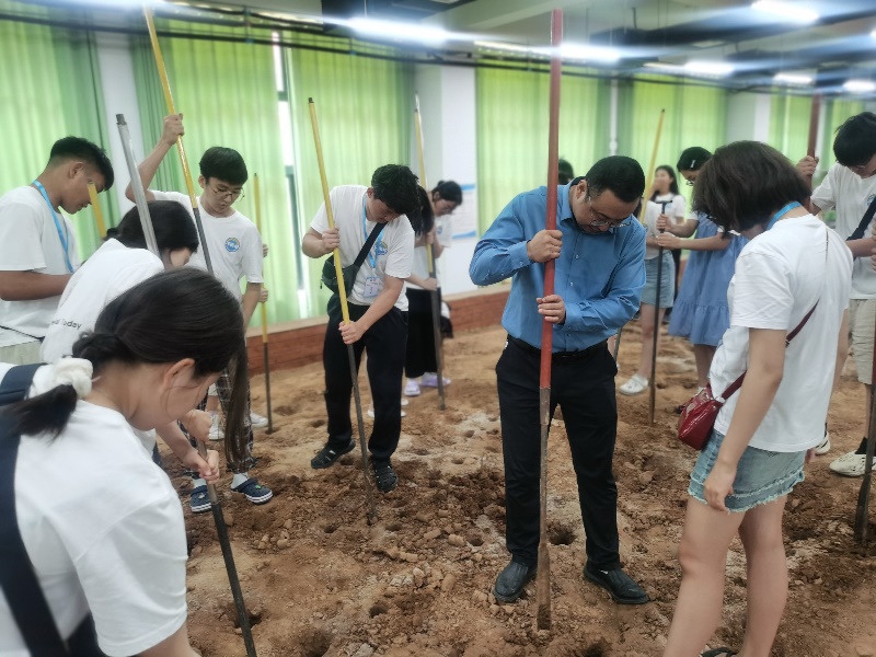 2024年6月3日上午,来自蒙古国陶立特中学“汉语桥”线下交流团学生到文物保护考古学院交流学习,沉浸式体验文物考古技术专业特色课程。体验课上,18名师生在文物考古技术教研室主任潘付生的示范带领下,学习传统拓印技术和考古神器洛阳铲的使用方法,兴致高昂地体验传统的碑刻拓印技术,认识洛阳铲,亲自上手钻孔探掘,体验中国考古的独特魅力。