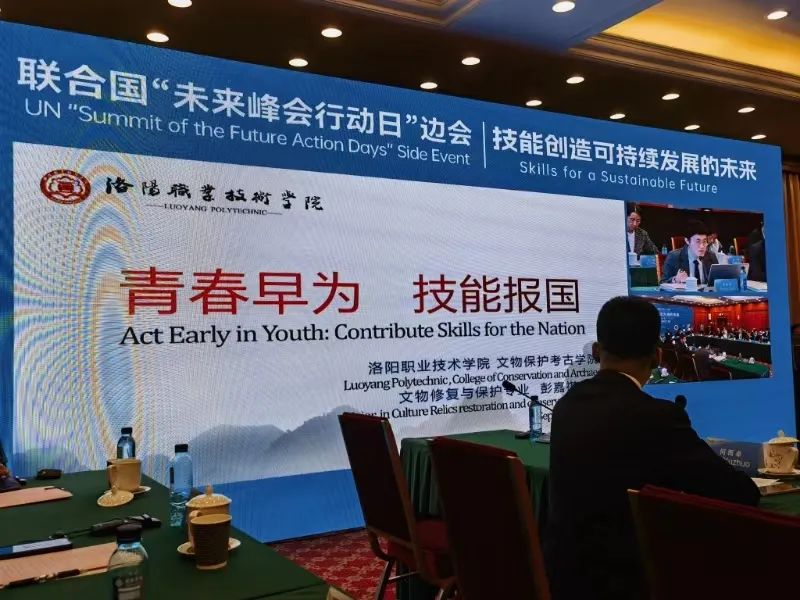 2024年9月21日,联合国“未来峰会行动日”边会——“技能创造可持续发展的未来”“一带一路”职业教育对话会在北京举行。 作为此次边会邀请的3名全球青年技能人才代表之一,洛阳职业技术学院文物修复与保护专业学子彭嘉祺作主旨发言,向世界发出了文化遗产保护的中国声音。据悉,此次会议由中华职业教育社主办,联合国教科文组织国际工程教育中心和欧中“一带一路”文化、教育、旅游和经贸发展委员会协办。会议主题为“技能创造可持续发展的未来”。