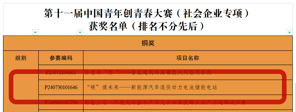 11月8日,第十一届中国青年创青春大赛在天津闭幕。我校项目《“碳”循未来——新能源汽车退役动力电池储能电站》荣获全国铜奖,成为学校首个国家级双创竞赛荣誉。
