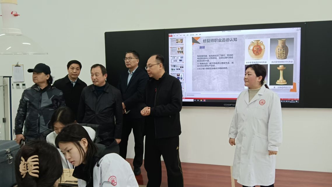 杨小柄一行实地参观了陶瓷器制作、考古探掘、陶瓷文物修复、青铜文物修复、石窟寺文物修复、纸质文物修复、文物数字化保护等实训室,以及文物修复与考古探掘仿真虚拟实训基地等。