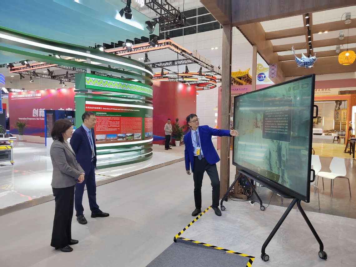 11月20日至22日,备受瞩目的2024年世界职业技术教育发展大会在天津国家会议中心举行。作为河南省唯一参展院校,我校石窟寺保护专业教学虚拟仿真系统参展作品惊艳亮相大会专题展,并成为全国仅有的3个高职院校汇报参展作品之一。教育部副部长吴岩,中国职业技术教育学会会长、教育部原副部长鲁昕,教育部职业教育与成人教育司司长彭斌柏,河南省教育厅厅长毛杰、副厅长张国强等现场参观指导,我校党委书记赵健参加专题展。