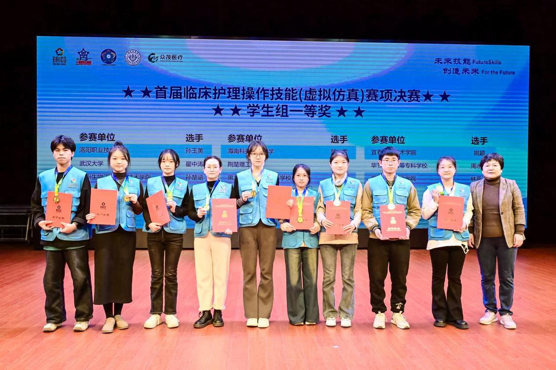 首届临床护理操作技能(虚拟仿真)赛项决赛于12月5日至8日在上海举行,比赛聚焦临床护理实践核心技能,以促进临床护理思维培养为宗旨,全面考查选手基于典型工作任务的核心技能、职业素养等职业胜任能力,共有来自全国179支队伍参赛。决赛中,我校参赛师生展现了极高的专业素养和竞技水平,凭借着精准的操作技能、敏捷的思维反应,在虚拟仿真环境中完成了多项复杂的临床护理操作任务,最终,护理与康养学院22级护理专业315班孙玉美荣获学生组一等奖第一名,护理专业301班张亚婷、307班郭嘉琳收获学生组二等奖,教师刘晶晶、张玉晶、李静团队荣获教师组一等奖。同时,学校还收获了学生组最佳组织奖、优秀组织奖以及教师组最佳组织奖。