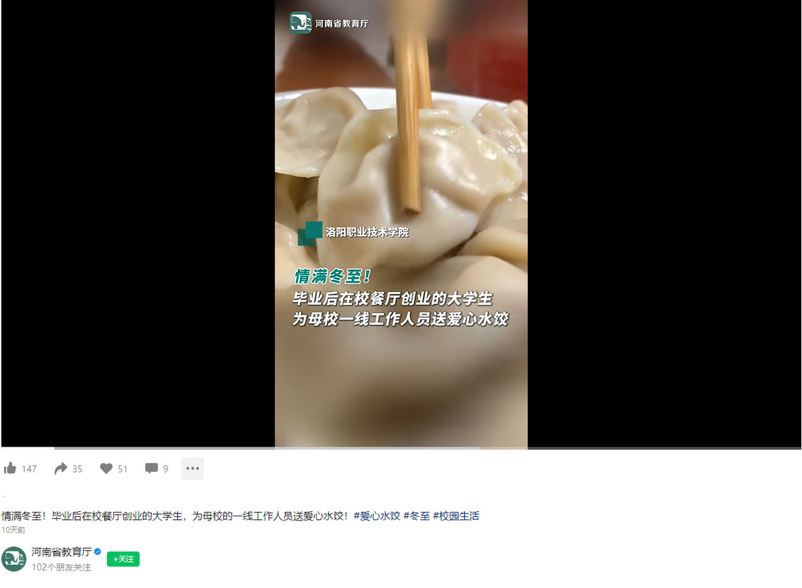 河南省教育厅视频号:情满冬至!毕业后在校餐厅创业的大学生,为母校的一线工作人员送爱心水饺!