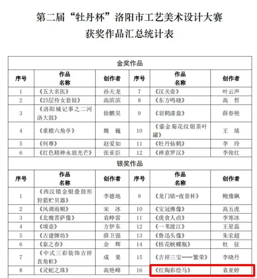 第二届“牡丹杯”洛阳市工艺美术设计大赛共有来自全市工艺美术行业105人报送的258件/套作品参赛,作品涵盖陶瓷、金属、雕刻、刺绣、漆器、珠宝、花画、民间手工艺等9大类20多个品类。经过专家评委严格评审,共有12件艺术作品荣获金奖、16件艺术作品荣获银奖、27件艺术作品荣获铜奖、36件艺术作品被评为“优秀作品奖”。洛阳职业技术学院文物保护考古学院教师袁亚婷参赛作品《红陶彩绘马》收获银奖。