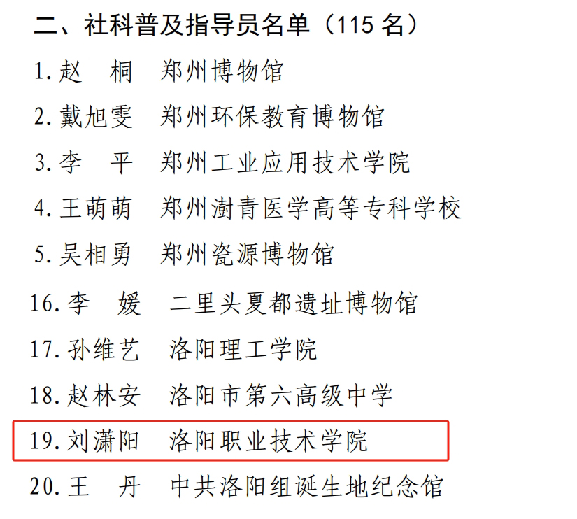 其中,会计学院院长刘潇阳入选社科普及指导员表扬名单,文物保护考古学院《让文物“活起来”--古都遗址志愿服务队助力地方文物保护与文化传承志愿服务项目》入选社科普及志愿服务活动项目表扬名单,食品与药品学院“萤火虫”科普宣传博士服务团、戏曲艺术学院致远大学生艺术团入选社科普及志愿服务团队表扬名单。