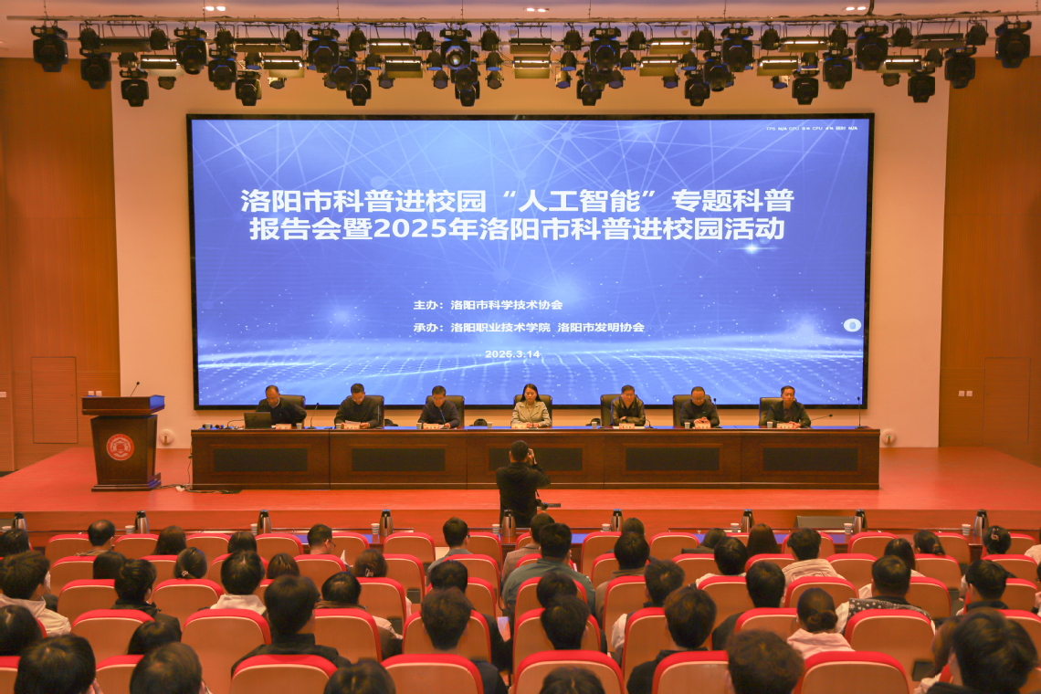 3月14日,洛阳市人工智能专题科普报告会暨2025年科普进校园活动在我校启动。洛阳市科学技术协会主席赵丽、副主席杨亚珲,民革洛阳市委会副主委、洛阳市发明协会理事长李克寒,我校副校长韦元民出席启动仪式。