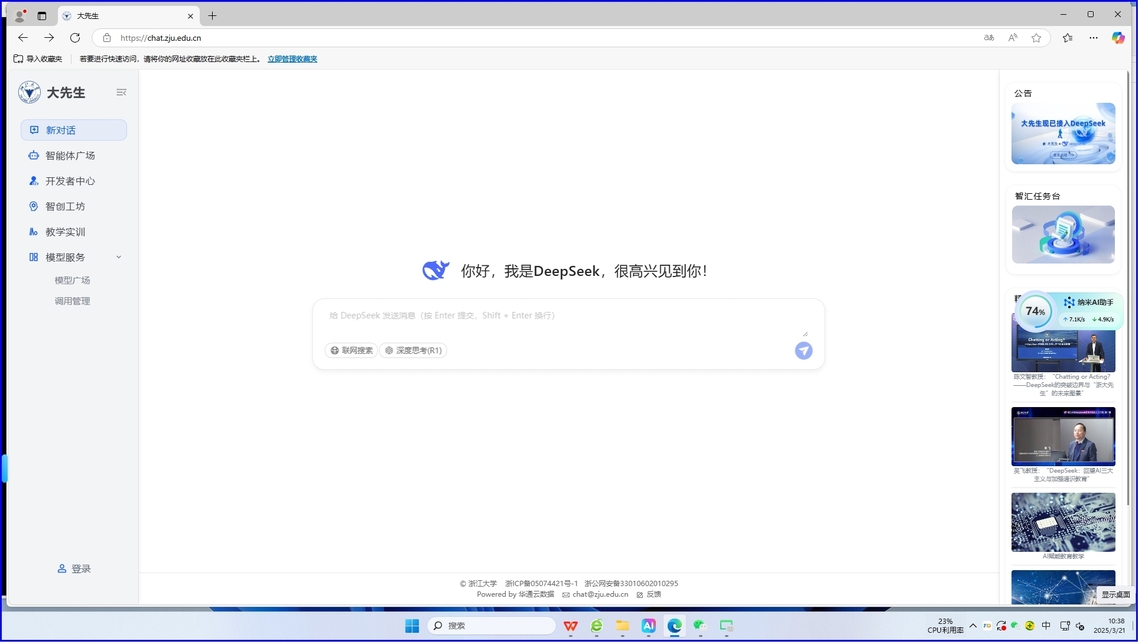 近日,我校成功接入浙江大学满血版DeepSeek人工智能平台“浙大先生”,为全校师生学术研究、教学实践与校园生活注入强劲动能。