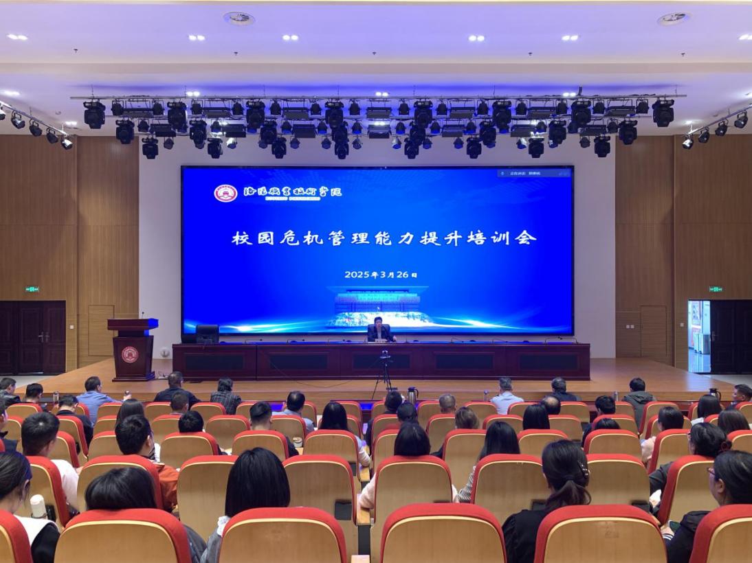 3月26日,我校在大学生活动中心学术报告厅举办校园危机管理能力提升培训会,辽宁生态工程职业学院党委学工部部长刘明耀副教授作专题培训。副校长张卫国出席会议并讲话。