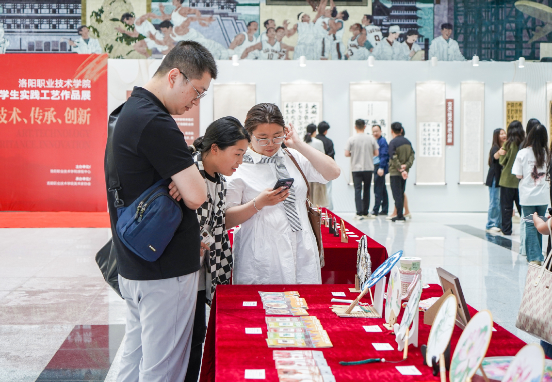 赵健认真查看参展作品,同师生深入交流,详细了解作品创作过程。他高度评价学生实践能力和创作技能,鼓励广大学生要认真学习专业知识,继续保持对艺术的热爱和对工匠精神的追求,不断提升综合素质和职业技能,努力创作出更多优秀作品。