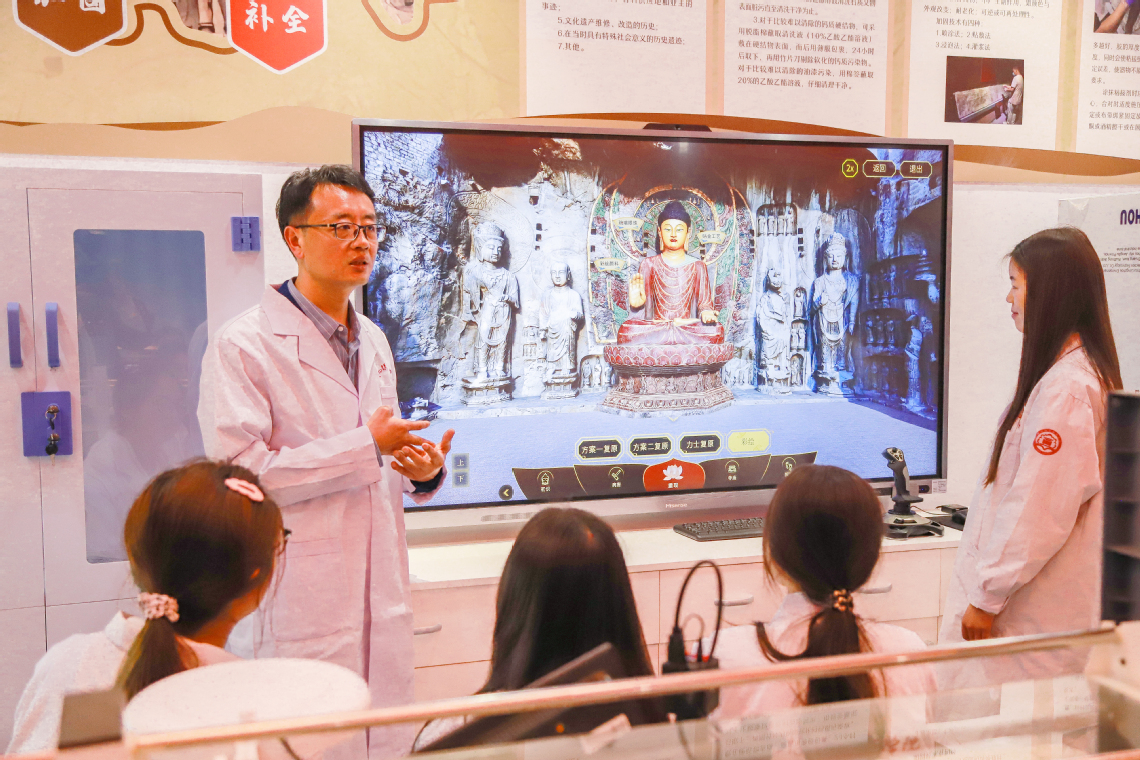 同时,实训室内的龙门石窟奉先寺病害分析及复原展示系统平台,可以通过视频、图片、动画等多种展示形式,以及交互操作的方式,帮助石窟寺保护技术专业的同学们更清晰、更直观地了解龙门石窟的病害及处置,让学生在沉浸式场景中提升实操技能。
