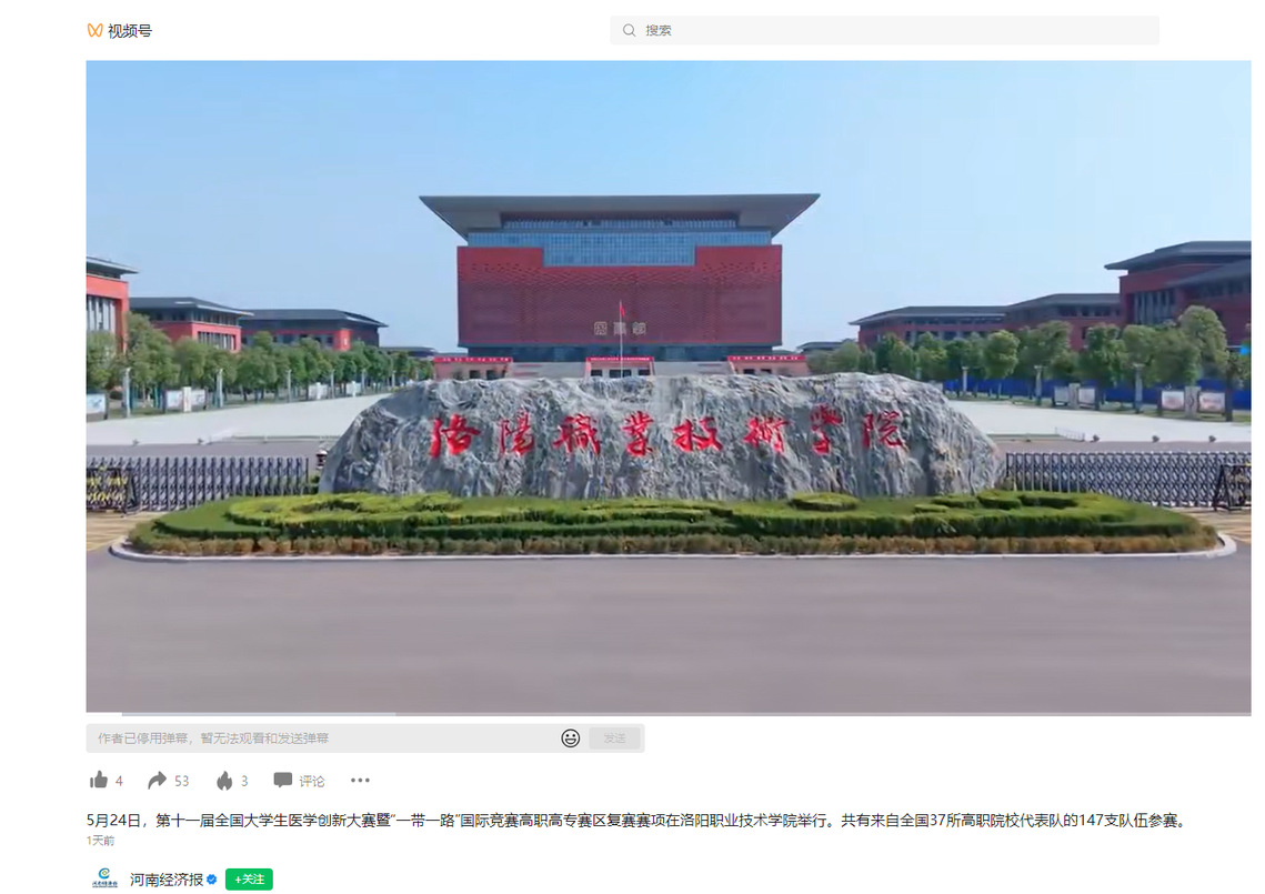 河南经济报:5月24日,第十一届全国大学生医学创新大赛暨“一带一路”国际竞赛高职高专赛区复赛赛项在洛阳职业技术学院举行。共有来自全国37所高职院校代表队的147支队伍参赛。