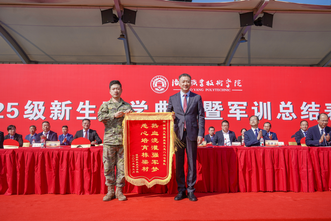 中国人民解放军95827部队上尉战勤参谋刘宇宣读军训先进连队、军训先进教官和优秀学员表彰文件。先进集体代表和先进个人依次登台领奖。校领导分别向各承训单位赠送锦旗。2025级新生代表、2024级学生代表、教师代表、新生家长代表分别发言。