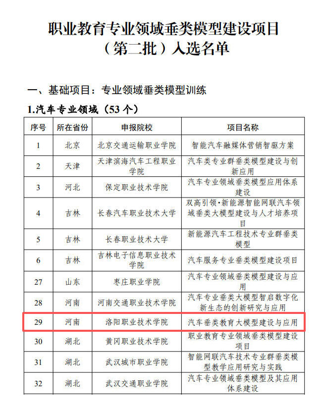 近日,教育部职业教育发展中心公布了职业教育专业领域垂类模型建设项目(第二批)入选名单,我校汽车垂类教育大模型建设与应用项目成功入选。