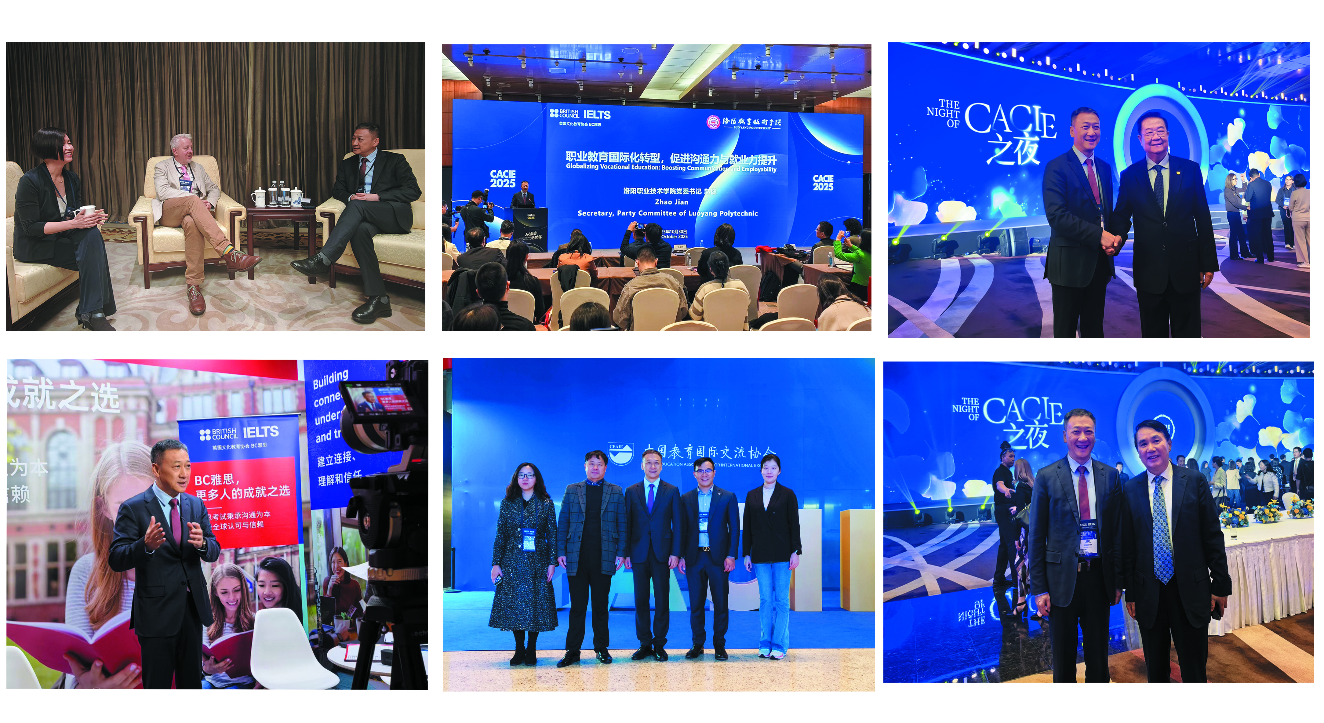 年会期间,赵健与中国国际教育年会会长、秘书长深度交流,推介学校国际化办学模式及实践成果,并合影留念。在与BC全球英语与考试业务合作伙伴关系总监Dylan Jones会谈中,赵健围绕中西方高等职业教育差异、国际化人才就业通路、跨文化交际能力培养等与其深入探讨,并接受BC官方专题采访。赵健还与兄弟院校代表深入交流。