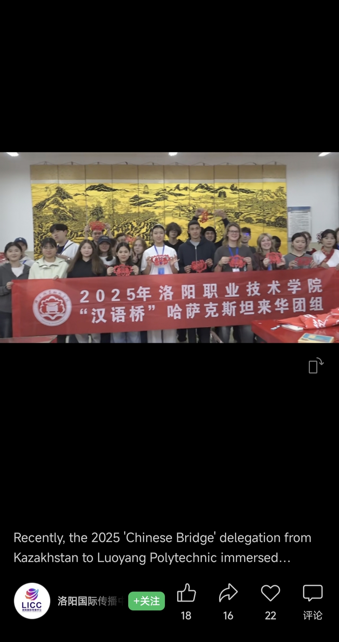 洛阳国际传播中心:洛阳职业技术学院“汉语桥”哈萨克斯坦来华团组来到洛阳,体验中国非遗,感受河洛文化。