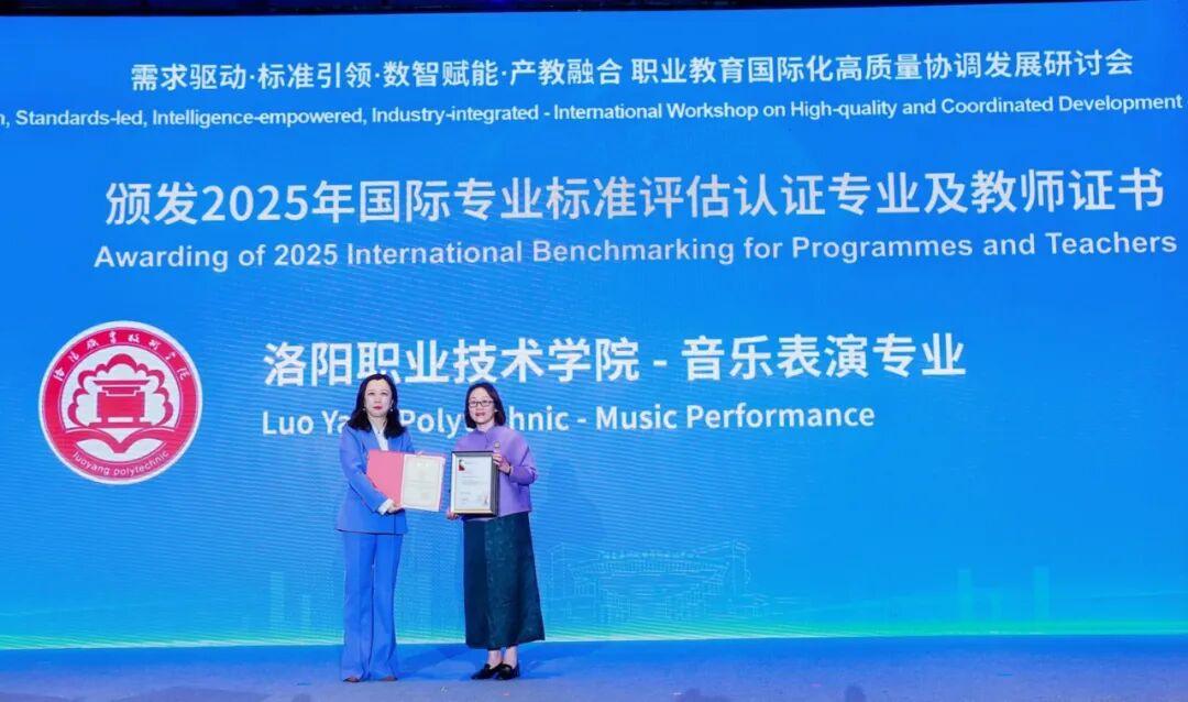12月5日至8日,首届博鳌职业教育发展大会暨国际产教融合展览会在海南博鳌举行。“需求驱动·标准引领·数智赋能·产教融合”职业教育高质量协调发展国际研讨会上,发布了国际专业标准评估认证成果,我校音乐表演专业通过英国国家学历学位评估认证中心(UK ENIC)国际专业标准评估认证,英国国家学历学位评估认证中心、世界技能发展联盟中国首席代表李华杰向学校颁发认证证书。