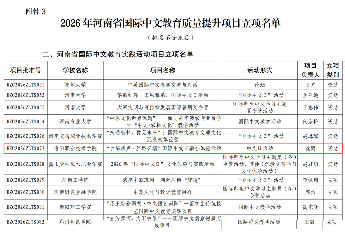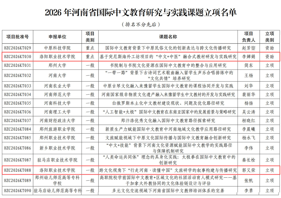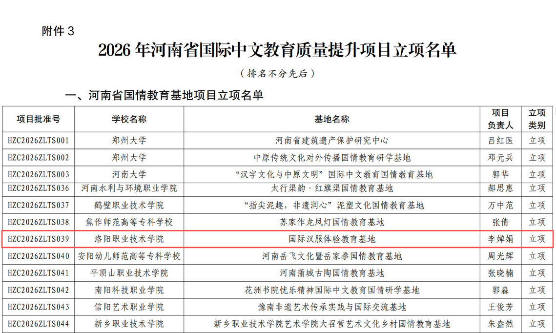 近日,河南省教育厅公布2026年河南省优质国际化课程、国际中文教育研究与实践课题、国际中文教育质量提升项目立项名单。洛阳职业技术学院4个项目成功获批立项。