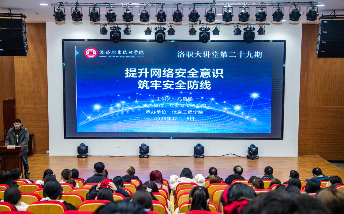 12月18日,由党委宣传统战部主办,信息工程学院承办的洛职大讲堂第29期在大学生活动中心心理剧场举行。国家网络安全教育技术团队融合和发展专家马翼鹏应邀开讲。
