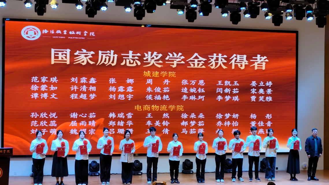 活动现场,获得2024-2025学年国家奖学金、学院奖学金,以及在河南省第18届“诚信校园行”学生资助宣传教育活动中获奖师生代表依次上台领奖。