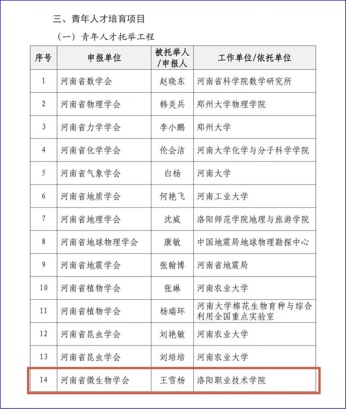 河南省科学技术协会2026年度学会学术项目分为学术交流活动项目、学会协同创新项目、青年人才培育项目、学会能力提升项目、海外及港澳台交流合作项目。作为青年人才培育项目的重要内容,青年人才托举工程是河南省科学技术协会为支持有潜力的青年科技人才独立开展科研工作、加快成长步伐而设立的重要人才项目,旨在通过稳定支持,助力青年科技人才在科研黄金期脱颖而出,成为科技创新的生力军。