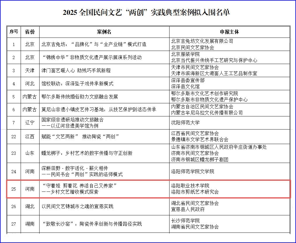 近日,中国民间文艺家协会公布2025全国民间文艺“两创”实践典型案例入围名单,由我校和洛阳市剪纸艺术研究会联合申报的“‘守着娃 剪着花 养活自己又养家’——乡村文艺增收模式探索”案例入围全国39项典型案例。