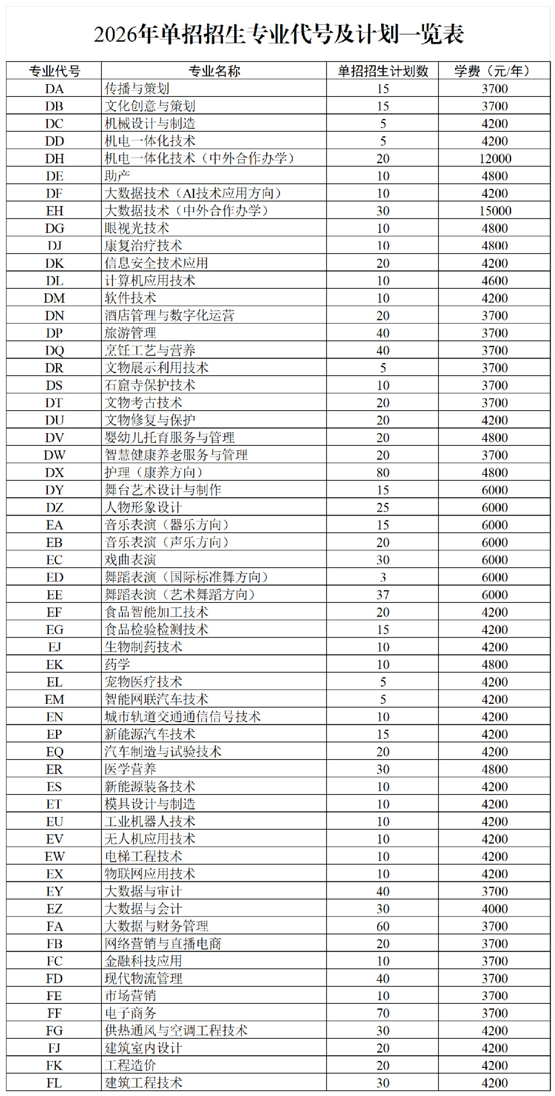 2026年单招招生专业代号及计划查询
