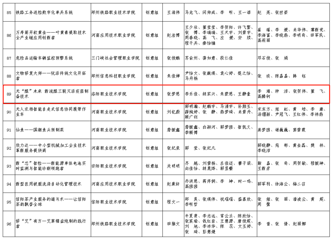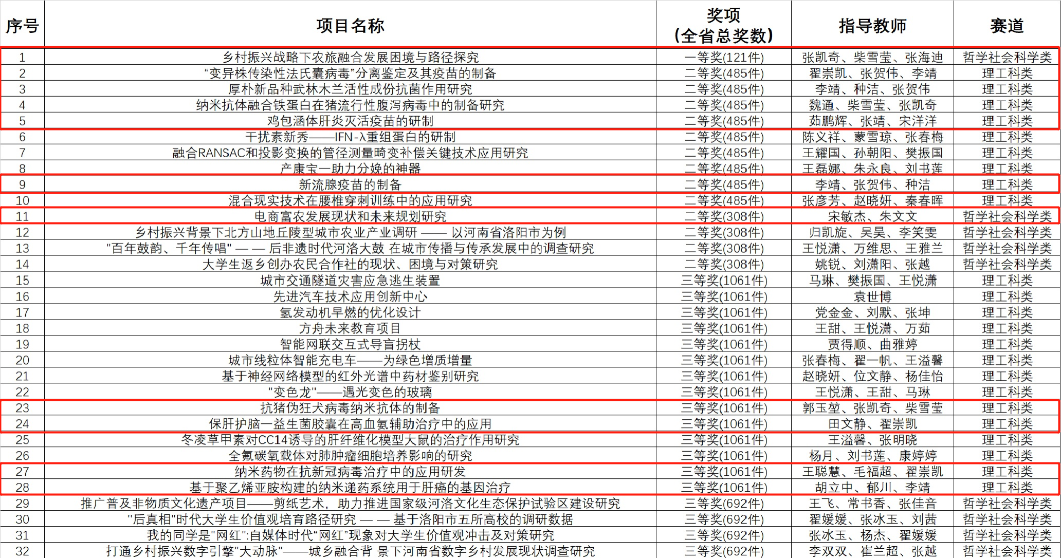 此外,河南省教育厅发布了《关于对2023年河南省“互联网+”大学生创新创业大赛职教赛道比赛暨第九届中国国际“互联网+”大学生创新创业大赛职教赛道河南赛区选拔赛拟获奖名单的公示》,我院参赛项目《探为“冠”止——纳米冠状通用疫苗先行》在大赛中荣获职教赛道三等奖,也是我校职教赛道唯一一项获奖项目。