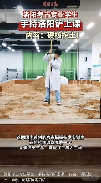 洛阳日报:洛阳考古专业学生,手持洛阳铲上课 !内容:硬核挖土!