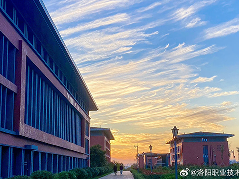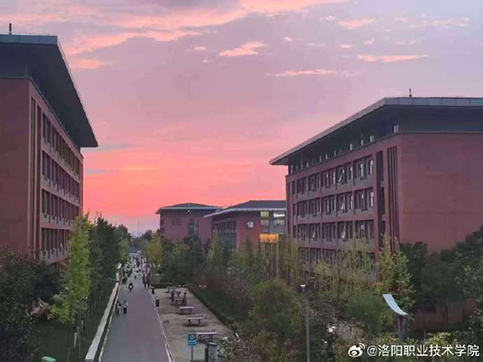 晚霞把校园的红砖楼染上温柔的粉橘色,路上的行人都成了这幅画里的点缀。