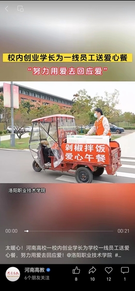 河南高教微信视频号:太暖心!河南高校一校内创业学长为学校一线员工送爱心餐