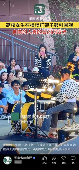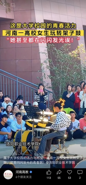 河南省教育厅微信视频号:河南一高校女生在操场打架子鼓